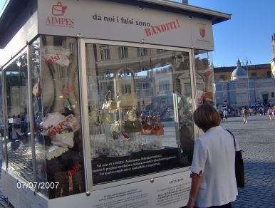 Na Piazza del Popolo, após quase duas horas de passeio em uma das mais famosas ruas de comércio da capital italiana, a Via del Corso, entre as principais marcas da moda internacional, o cidadão se depara com a vitrine acima. Lá dentro, uma série de produtos piratas tipo aqueles vendidos nas ruas de Veneza (veja nota anterior) recolhidos das mãos de contrabandistas e vendedores ambulantes, que podem ser encontrados nos corredores das estações de metrô e ruas secundárias.