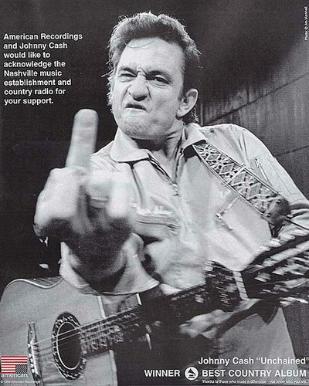Os que usam o dedo médio para expressar os seus sentimentos deveriam aprender com o grande mestre Johnny Cash, que ensinou que para fazer isso com dignidade é preciso estar por cima e, mais que isso, ter absoluta certeza disso. Foi o que aconteceu em 1996, quando foi à forra depois de ser premiado como Melhor Álbum Country pelo fabuloso disco Unchained. Do alto de seus então 64 anos de sabedoria, Cash pagou um anúncio de página inteira na BillBoard, a principal revista de música do país, para agradecer o apoio recebido das rádios e do meio musical de Nashville, a meca do Country, que haviam ignorado o disco.