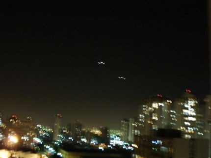 Não é OVNI, não. De acordo com o ouvinte-internauta que se identificou na mensagem apenas como Roberto, são dois aviões próximos de mais no céu de São Paulo. A foto foi registrada da janela do apartamento dele, na Vila Leopoldina, que acompanha diariamente o movimento dos vôos na cidade: “Quando vi dois aviões super perto, estava no telefone com um amigo e comentei com ele que os aviões iriam se chocar, deu tempo de pegar minha câmera no guarda roupa, ligar a câmera e fazer a foto que você está vendo agora, eles se separaram por pouco”.