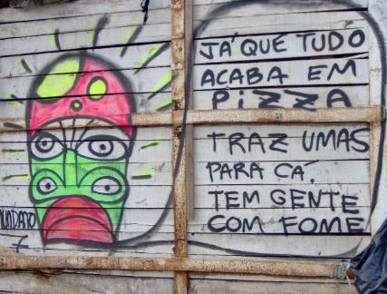 Na mira da câmera aparece a mensagem no muro da favela. Sem esperança de mudança na política, a turma já se satisfaria com um mínimo de dignidade: não morrer pela fome.