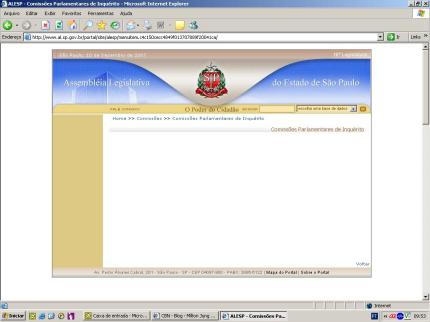 Reprodução da página da Assembléia Legislativa de São Paulo sobre o trabalho das Comissões Parlamentares de Inquérito em atividade (?). Procure neste blog e você verá o balanço das CPIs feito pelo Movimento Voto Consciente