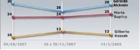 A pesquisa do Instituto Datafolha, divulgada neste fim de semana, ajuda todo mundo (mundo este restrito a três candidatos, lógico). Pois se Alckmin segue líder nas intenções de voto, Martha saiu-se bem na preferência do eleitor, e Kassab apesar de não deslanchar tem esperanças. A seu favor, o fato de ter melhorado na avaliação do paulistano.