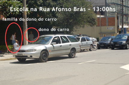 Carro parado em fila dupla, praticamente jogado no meio da rua, e a família feliz segue para a escola das crianças, onde vão aprender lições de cidadania que os pais parecem ter esquecido.