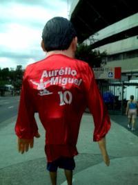 Torcedores que estiveram no estádio do Morumbi, nesse fim de semana, encontraram a figura acima desfilando de lá prá cá e de cá prá lá, vestindo a camisa do São Paulo e estampando o nome do vereador Aurélio Miguel (PR), ao lado do número 10.