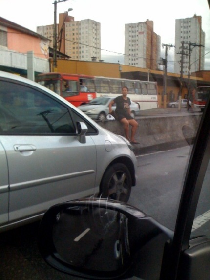 Radial Leste, manhã chuvosa de segunda-feira. A mulher sentada na mureta que divide as pistas de uma das mais movimentadas vias de São Paulo já havia atravessado metade da pista, faltava a outra metade. O ouvinte-internauta Daniel Santiago registrou a imagem mas não teve tempo de esperar para ver se a tentativa de “suicidio” da pedestre teria sucesso.