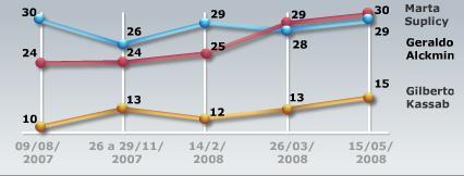 A superexposição do prefeito de São Paulo, Gilberto Kassab (DEM), resultado da maratona de inaugurações programada para o período pré-eleitoral, não foi suficiente para “bombar” a candidatura dele, segundo o Instituto Datafolha. Na disputa à prefeitura de São Paulo, a ministra Martha Suplicy (PT) tem 30% das intenções de voto enquanto Geraldo Alckmin (PSDB) tem 29%. Empate técnico que permanece desde a pesquisa anterior. Para o atual prefeito restou o terceiro lugar com 15% das intenções de voto. Ninguém variou acima da margem de erro que é de 3%.