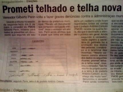 O prefeito Antônio Cettolin (PMDB-RS) que administra a pequena e simpática cidade gaúcha de Garibaldi, na região da Serra, recebe toda quarta-feira, moradores em seu gabinete. Uma das senhoras que compareceu por lá pediu ajuda para a casa dela e recebeu a promessa, escrita de próprio punho no rodapé de um cadastro de visita, de que teria o telhado e as telhas que tanto precisava para a reforma. O papel foi parar nas mãos de um vereador do próprio PMDB que denunciou em plenário o que entende ser “prova de corrupção eleitoral .