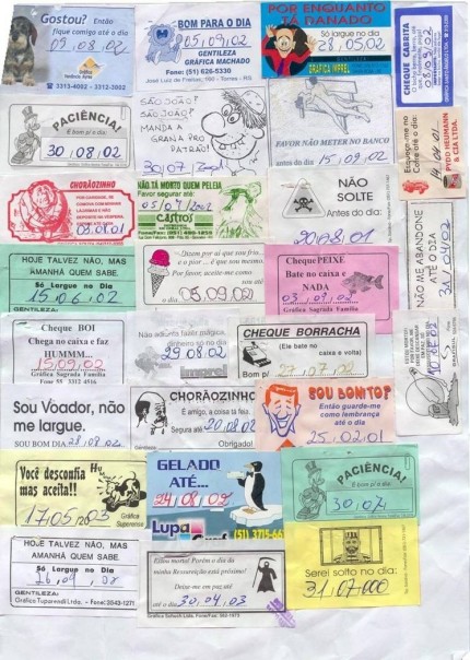 Conforme mensagem enviada pela internet, um bancário teria reunido os “contratos” colados nos cheques em uma coleção inusitada que mostra, entre outras coisas, a criatividade nacional.