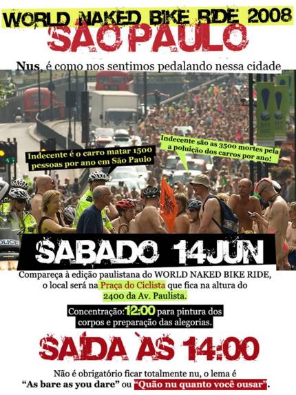 Um movimento inusitado está marcado para o sábado, dia 14, em São Paulo. Para protestar contra o desrespeito aos ciclistas, será realizada a versão brasileira do World Naked Bike Ride. Ao pé da letra: pedalar nu pela cidade.