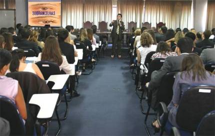 Não deixe de perceber o painel do lado direito da imagem, e o calçado do palestrante.
