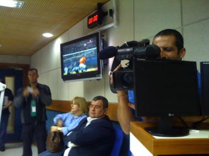 Dois assessores e uma equipe de TV, acompanham a entrevista