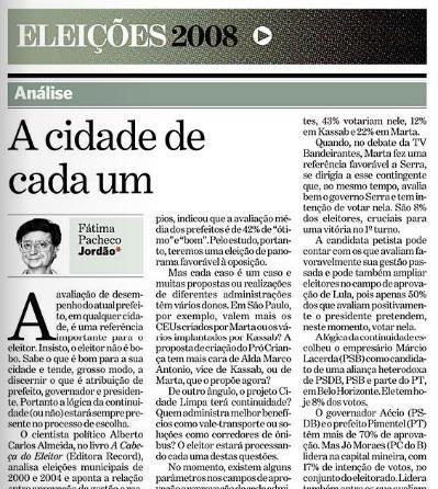2. Achei interessante o artigo porém prematuro nas analises dos pleitos de São Paulo E BH , lembremos que a campanha praticamente ainda não começou e acho que no caso de BH quando o peso das “máquinas” governamentais se fizer sentir , o “ungido” de plantão decola , o mesmo dar-se-ia aqui se o PSDB e DEM tivessem fechado questão num candidato (fosse ele o Alckmin ou o Kassab) e não dividido o eleitorado praticamente ao meio.