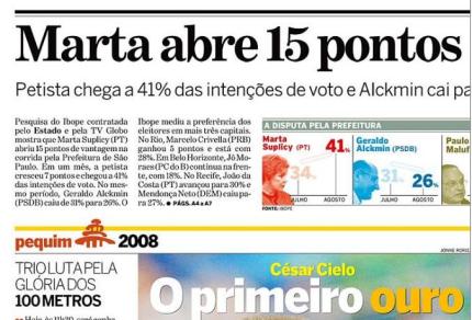 1. Eu acredito em estatística até certo ponto, quando é bem fundamentada. Em uma cidade do tamanho de SP, entrevistar apenas 805 eleitores para fazer uma manchete destas é vergonhoso. Não é estatística, é chute. Não representa, de forma alguma, a opinião geral da cidade. Não conheço ninguém que vote em Marta ou Maluf e de acordo com a pesquisa estes são 50% dos eleitores! A vitória da petista seria uma tragédia e um retrocesso para a cidade, então eu prefiro acreditar que isto não está acontecendo.