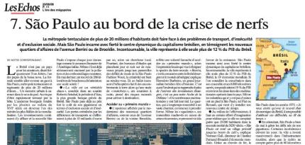 Este é o título da reportagem publicada no jornal francês Les Echos que destaca os problemas de trânsito, da insegurança e da exclusão social que atingem a capital paulista. A reportagem abre com citação de frase de Tom Jobim: “O Brasil não é um país para amadores”.