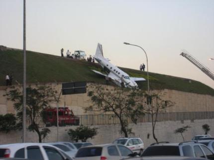 Um pequeno avião derrapou no momento da decolagem no Aeroporto de Congonha e foi parar no muro que separa a pista da movimentada Avenida Washington Luis. O bimotor era da companhia Ultrafarma Saúde e tinha abordo o piloto, o co-piloto e um passageiro. Apesar do susto, os transtornos se resumiram a atrasos em alguns vôos e ao congestionamento provocado pelos motoristas curiosos que passavam pelo local. Não é sempre que a gente vê um avião posando (sem “u”) na beira da pista.