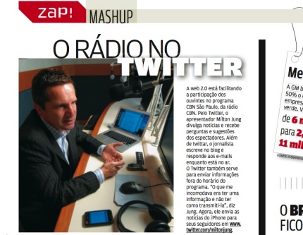 Desde fim de julho, o Twitter está integrado ao CBN São Paulo e se transformou em mais um canal de interação com os ouvintes-internautas (cada vez mais ouvintes, cada vez mais internautas). Nossa conversa digital chamou atenção do pessoal da Info Exame que fez reportagem publicada na última edição, já nas bancas.