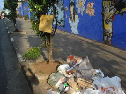 O esforço de dar vida aos muros no bairro da Bela Vista se perde na falta de educação daqueles que fazem da calçada lixão. A imagem acima é apenas um dos exemplos de descaso com a cidade registrados pelo ouvinte-internauta Marcos Paulo Dias em seu passeio de fim-de-semana na região.