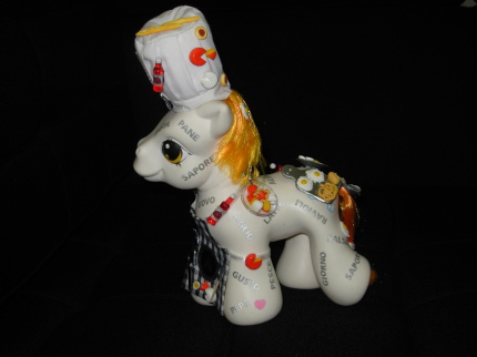 Lembra da Cow Parade que espalhou vacas estilizadas pela cidade ? Foi a primeira imagem que me veio a cabeça quando vi as fotografias dos My Little Pony travestidos. Este que você vê no blog foi inspirado no chefe de cozinha Alessandro Segato.