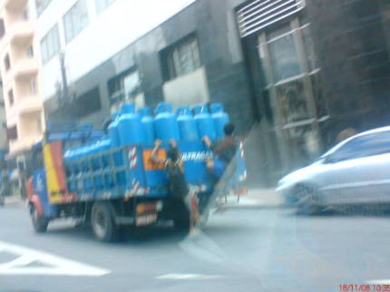 Na brincadeira perigosa, os dois meninos se penduram atrás do caminhão de gás no momento em que a Cátia Toffoletto seguia para mais uma pauta do cotidiano. Com o celular em punho, ela registrou a imagem que envia para você através do blog. O surfe de asfalto pode parecer uma grande diversão, mas põe em risco a vida desses garotos.
