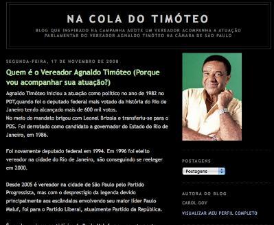 O novo blog a aderir a campanha Adote um Vereador é assinado pela ouvinte-internauta Carol Goy que decidiu acompanhar de perto o mandato de Agnaldo Timóteo. Ela não votou nele, conforme explica por e-mail, mas quer mostrar o desempenho do vereador reeleito pelo PR após avaliar o trabalho realizado nos primeiros quatro anos em que esteve na Câmara Municipal de São Paulo.
