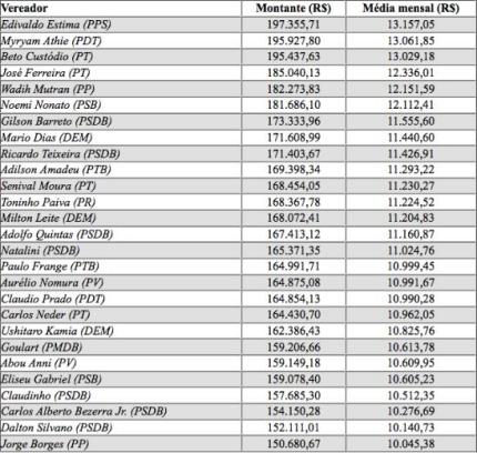 Abaixo a lista dos 27 vereadores que mais gastaram com verbas indenizatórias. Curiosidade: os três maiores gastadores não se reelegeram.