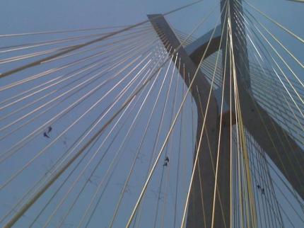 Seis homens pendurados a 100 metros de altura preparavam a decoração de Natal na ponte estaiada, no bairro do Brooklin, em São Paulo, neste fim de semana. Quase não se percebia a ação desses alpinistas minúsculos ao lado de algumas das 80 estrelas já instaladas. Cada um delas tem quatro metros de altura. Ao fim do trabalho, teremos uma gigantesca árvore de Natal que “dançarᔠde acordo com o ritmo da música a ser tocada. A inauguração será no dia 11 de dezembro, quinta próxima. Um espetáculo que poderá ser apreciado de dentro dos carros que costumam parar sobre e embaixo da ponte em congestionamentos sem fim.