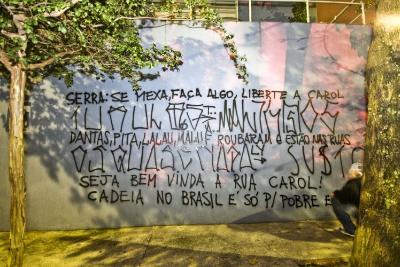 Pichando. Assim pichadores pediram a liberdade da pichadora. Prá que fique claro, me refiro a artesã Caroline Pivetta da Mota que ficou quase dois meses na cadeia porque pichou paredes do prédio da Bienal durante a mostra de arte que privilegiava o vazio. Carolibne foi libertada hoje.
