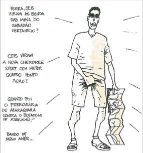 Cartum de Caco GalhardoO autor da HQ que causou mais uma polêmica na educação pública do estado de São Paulo diz que não daria para as filhas dele ler o livro que foi distribuído para os alunos de nove anos. Caco Galhardo é cartunista e um dos 11 convidados da coletânea “Dez na Área, Um na Banheira e Ninguém no Gol”, publicado pela Via Lettera, e recomendada como maerial paradidático nas escola estaduais de acordo com avaliação de uma comissão da Secretaria de Educação.