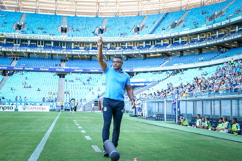 ver a bola rodando no meio de campo e jogadores se movimentando com rapidez pelos lados do gramado, mesmo que o que vimos tenha sido apenas um esboço do projeto que Roger desenha para o Grêmio. .