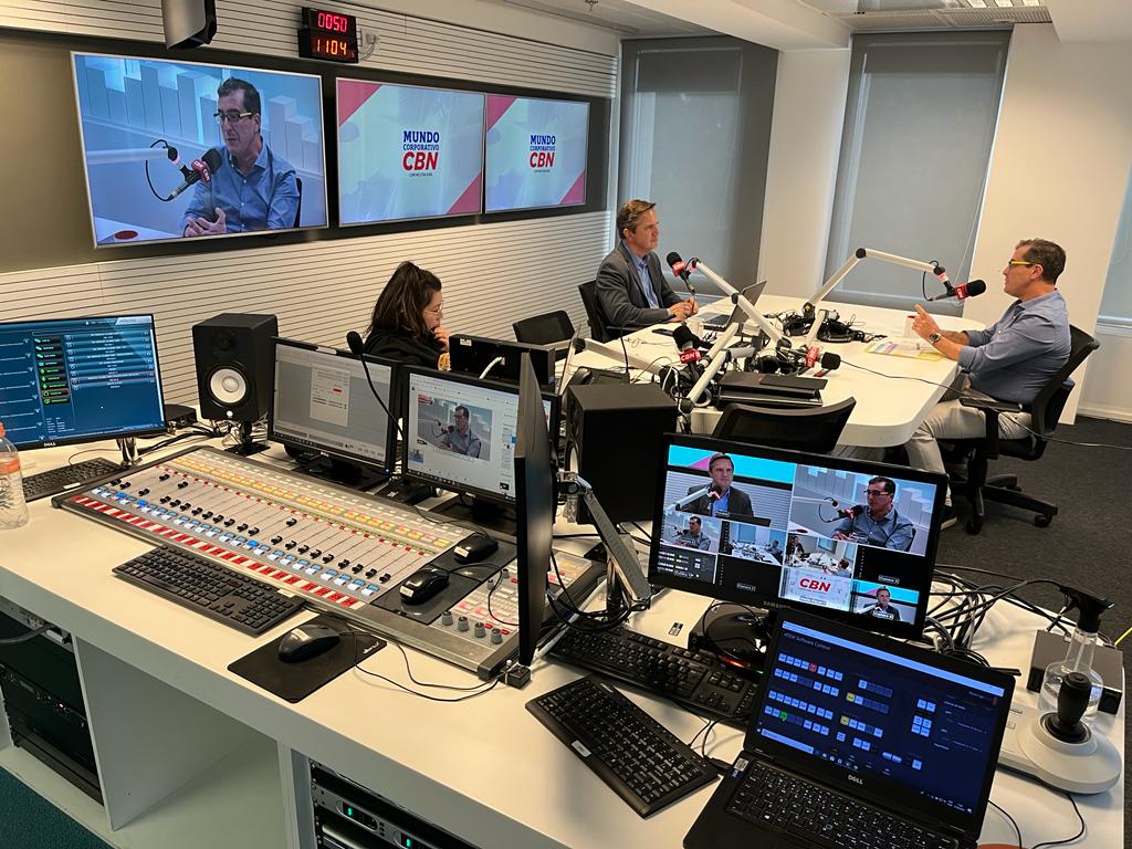 Reynaldo Naves no estúdio do Mundo Corporativo da CBN, em foto de Priscila Gubiotti