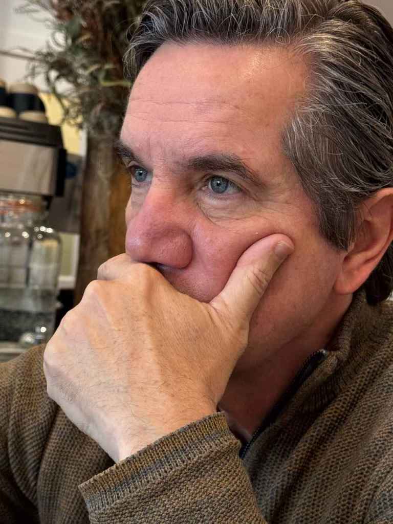 A mão que apoia o rosto oculta a boca — um gesto que pode ser tanto descanso quanto censura, impedindo-me de dizer em voz alta o que vagueia pela mente. As peneiras de Sócrates ainda filtram muito do que penso antes de transformar ideias em palavras. O olhar se destaca, aparentemente sem destino. Ou naquele instante eu mirava algo? Não lembro bem. Talvez estivesse apenas vagando, ofuscado pelos estímulos ao redor..