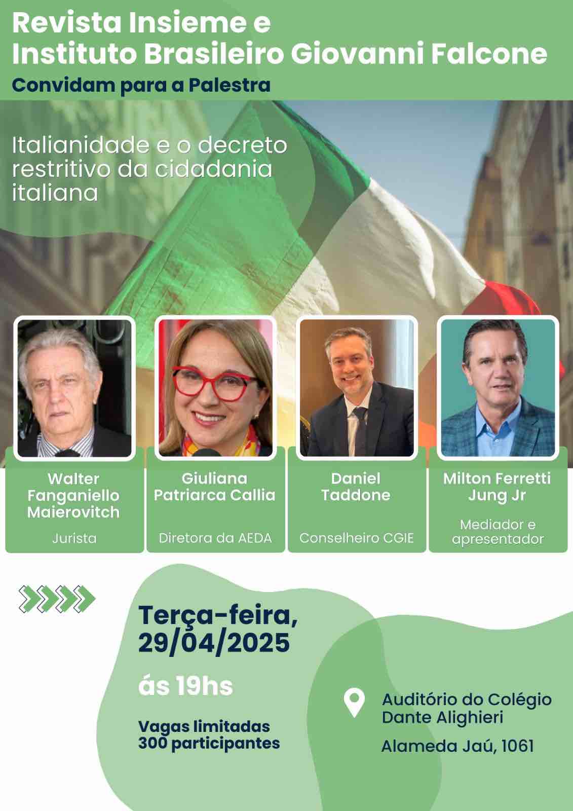Inscreva-se (de graça) e participe do encontro que discutirá o efeito do decreto que limita a cidadania italiana e prejudicará milhões de ítalo-descendentes, no Brasil. O jurista Walter Fanganiello Maierovitch, o Conselheiro do CGIE (Consiglio Generale degli Italiani all’Estero) Daniel Taddone e Giuliana Patriarca Callia, tradutora juramentada e diretora da AEDA, estarão reunidos no dia 29 de abril, a partir das 19hs, no auditório do Colégio Dante Alighieiri, em São Paulo.
