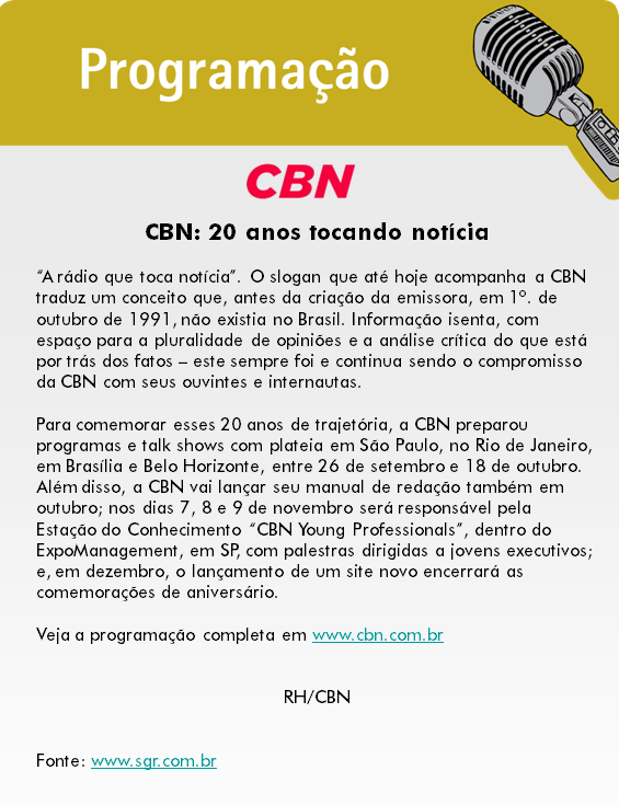 Identifique quem são os âncoras e comentaristas da CBN que estão nos anúncios em homenagem aos 20 anos da emissora, publicados em jornais e revistas brasileiros, e ganhe um exemplar do Manual de Redação da CBN. Registre a sua lista, com o nome de cada um e o número de 1 a 18, na área dos comentários aqui do Blog. Mesmo que alguns estejam repetidos é preciso identificá-los nos dois anúncios. As respostas publicadas no blog somente serão divulgadas ao fim do concurso, na quinta-feira, dia 20. Se houver mais de um acertardor, haverá um sorteio na redação para definição de quem receberá o prêmio. O ganhador será informado por e-mail. Divirta-se !