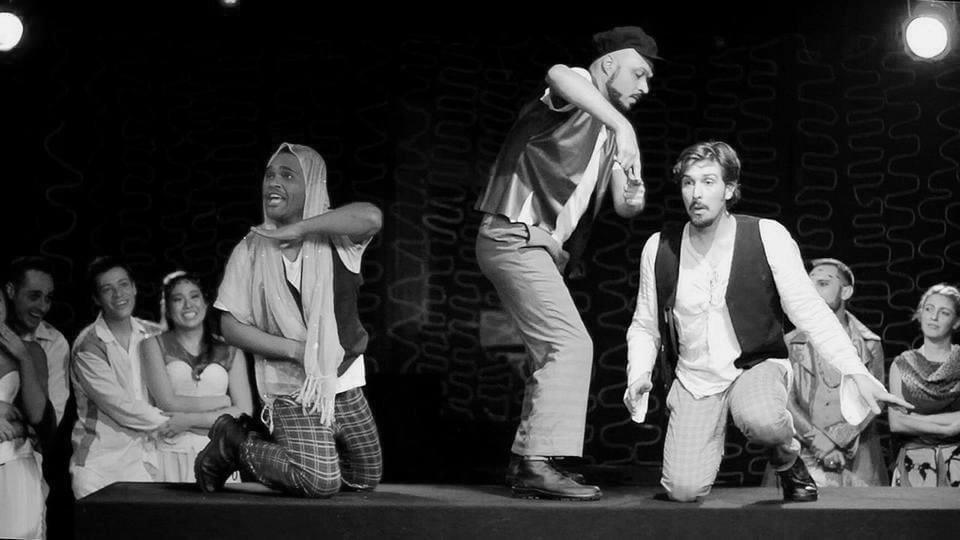 Pina, de joelhos a esqueda da foto, no palco do teatro em foto divulgação