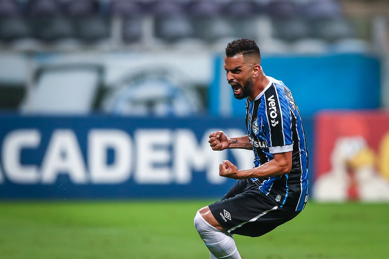 Everton comemora o gol da vitória contra o Goiás (foto do álbum do Grêmio Oficial, no Flickr)
