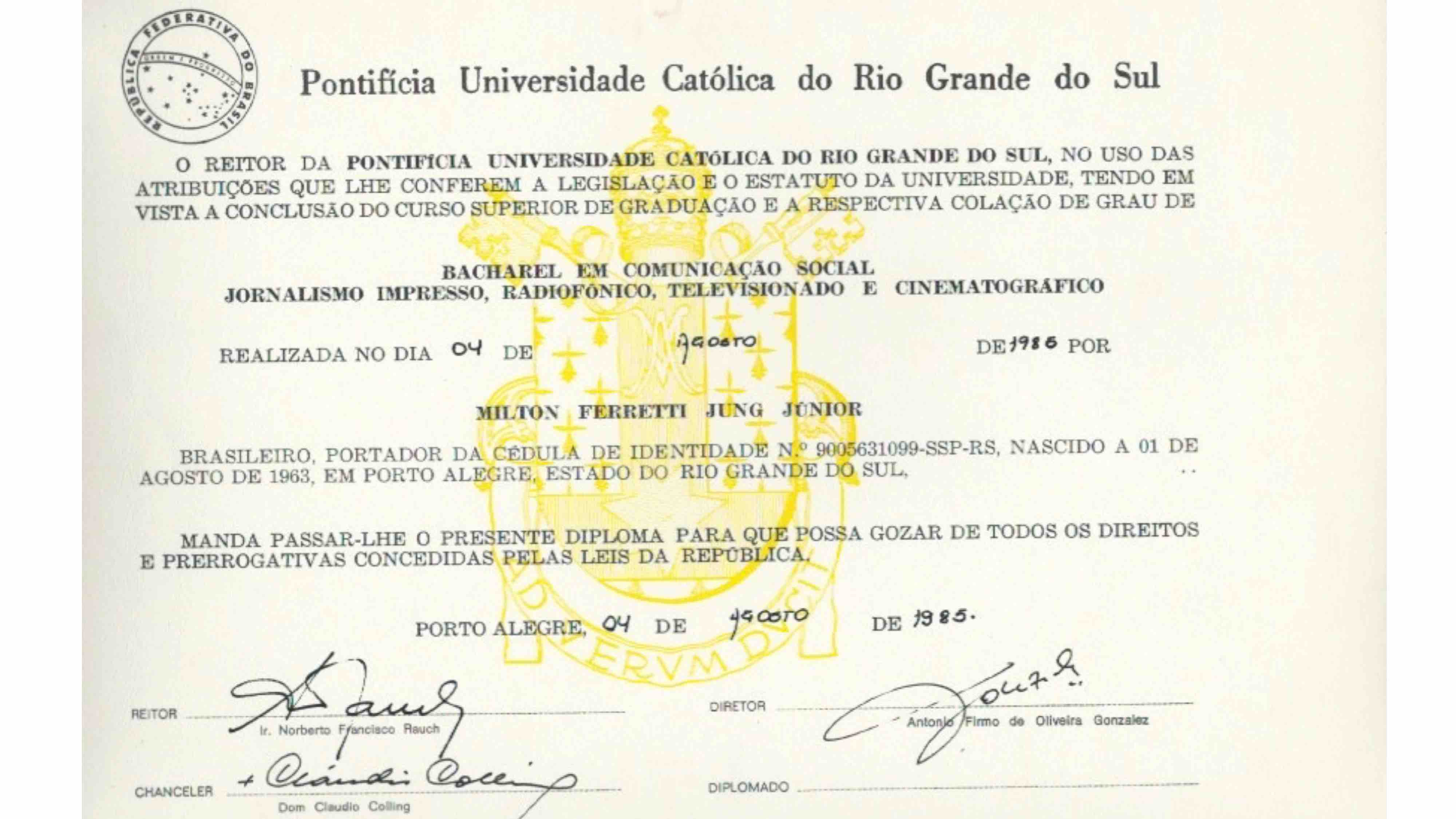 Natural de Porto Alegre, Mílton Jung começou sua trajetória na área da comunicação desde cedo, seguindo os passos de sua família de radialistas e jornalistas. Ainda criança, já frequentava redações e estúdios em sua cidade, onde desenvolveu sua paixão pelo jornalismo. Esse interesse o levou a se formar em Jornalismo pela PUCRS – Pontifícia Universidade Católica do Rio Grande do Sul e, posteriormente, a complementar sua formação com uma especialização em Marketing Digital pela Digital House Brasil.