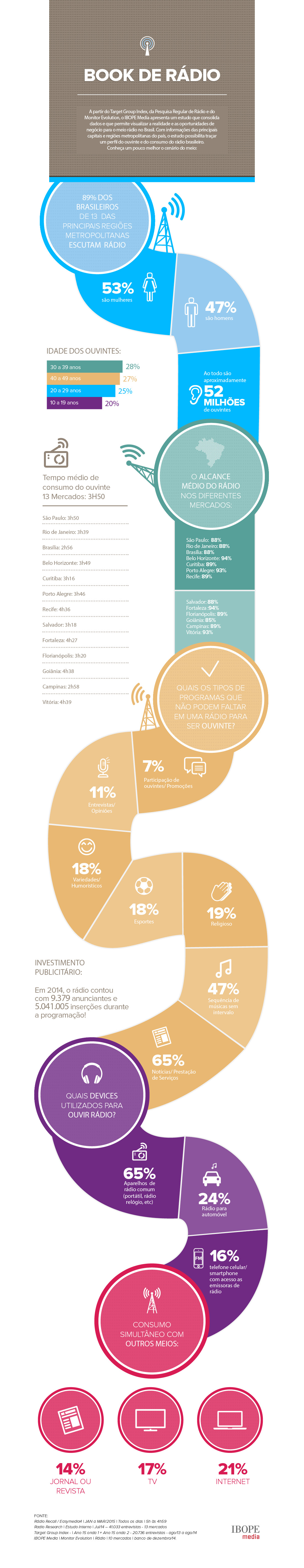 Foi no Meio e Mensagem, programa que vai ao ar, às 9h20, dentro do Jornal da CBN, que ouvi, pela primeira vez, os último dados publicados pelo Ibope Media sobre o consumo de rádio no Brasil. Logo me chamaram a atenção pela expressividade do veículo diante do público em momento no qual muitos questionam o papel das mídias consideradas tradicionais. Soube depois que o instituto produziu um infográfico com base nos dados do Target Group Index, da Pesquisa Regular de Rádio e do Monitor Evolution, que permite se ter ideia ainda mais clara do perfil do ouvinte e dos hábitos de consumo do rádio. É este infográfico que compartilho com você: