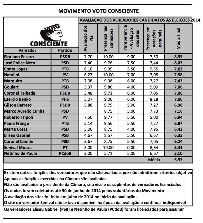 Reproduzo a seguir, material divulgado pelo Movimento Voto Consciente que avaliou o desempenho dos 17 vereadores de São Paulo que estão concorrendo nas eleições deste ano, a partir de quatro critério. O MVC informa que existem outras funções de vereadores que não são analisadas por não admitirem critérios objetivos. O material pode servir de base para o eleitor, porém é sempre importante lembrar que o cidadão deve levantar o máximo possível de informações sobre o candidato antes de decidir o seu voto: