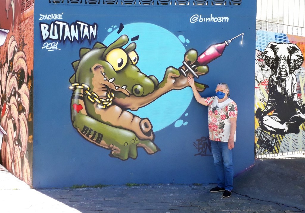 Fiquei muito tempo isolada e após tomar a segunda dose da Coronavac, do Instituto Butantã, meus filhos me levaram até a Vila Madalena para conhecer o Beco do Batman, na intenção de me distrair um pouco. Descobri que ficava bem próximo do cemitério São Paulo, onde meus pais estão sepultados. Após um breve pensamento em reverência a eles, adentrei pelo famoso beco. Fiquei admirada com as belezas dos grafites, sendo surpreendida por um que apresentava um grande jacaré com uma vacina na mão. Acima dele, o registro do autor da obra, que coincidentemente também era ligado ao bairro do Butantã.